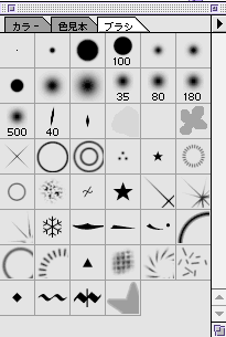 ブラシはなんかあるんだよね?付属の…どっかから読み込めば見つかります。フォトショ5なら。で、コントロール+クリックで明らかに要らないのは削除。下はカスタムブラシ…なんかでつくったんだよ…ブラシのオプションで(右上の野次るし)でブラシに定義したのかなあ…?あると大変便利です。 |