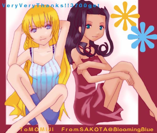3700を取ってくださった角倉もみじ様からのリクですvvvラチェットと織姫です。服は自由と言うことで、(変える必要もないのに)キャミソールに猛ダッシュしました(笑)レニがいないからやってみたかったんです。レニがいるとできないおいろけーなせくしーな二人を……レニがいるとどうも可愛い系に走るもので…まあ私に色気いといわれても無理がありますから、色気をだせってリクじゃないですし…でも描いている間頭は輝きなんて聞いてたらはずかしくなるほどに桃色片思いです。あと私はラッチュとエリカとサキさんのかきわけができません。困った! |